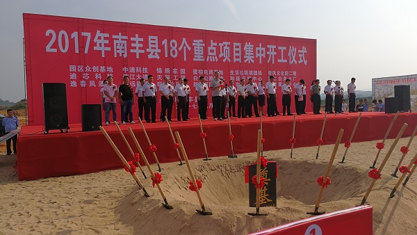 為進(jìn)一步營造濃厚的項目建設(shè)氛圍,推動縣域經(jīng)濟(jì)趕超發(fā)展,2017年8月20日上午8:28,南豐縣18個重點項目集中開工儀式在黃金工業(yè)園區(qū)舉行。撫州市副市長徐國義出席儀式并講話;縣委書記吳自勝宣布開工并講話;縣委副書記、縣長樂啟文致辭。隨后,南豐曠遠(yuǎn)能源有限公司、城區(qū)飲水工程和園區(qū)眾創(chuàng)基地的代表分別代表企業(yè)發(fā)言。