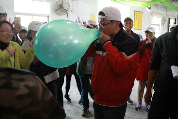 吃過午飯后,經(jīng)過一個小時的休息,拓展活動繼續(xù)進(jìn)行。下午的第一個活動為“牛皮吹破天”,要求各小組將所發(fā)全部氣球吹爆,總計時間最短的小組獲勝。裁判根據(jù)氣球頭數(shù)量核實(shí)戰(zhàn)績。游戲開始時,各小組的男士們紛紛發(fā)揮紳士風(fēng)度,爭分奪秒,氣球爆炸聲此起彼伏,為了加強(qiáng)娛樂性,裁判組分別給每個小組分發(fā)一個大氣球,每次大氣球的吹爆過程都能引來隊員們的側(cè)目相看,隊員們臉上露出各異的表情,或驚奇,或興奮,或賊笑……